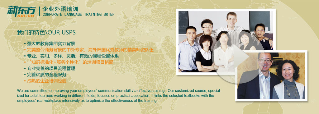 把真实的国际商务活动与系统的英语语言知识和技能密切结合在一起。在学习语言的同时,了解更多的国际商务知识。我们本着真实、实用的原则,在讨论问题、安排议程、设计项目、准备新闻发布等等活动中,切切实实的帮助学员提高实战能力和技巧,并有效地把课程细分成口语和写作两个部分,按照应用的灵活性可以分开培训,也可以结合起来学习。